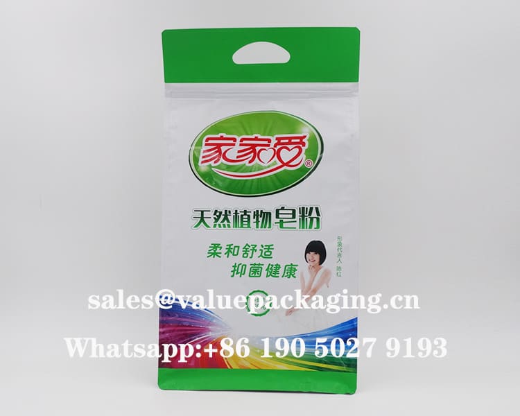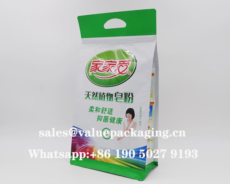 The bag is designed with a handle for easy taking and carrying by consumers; the sealed structure of the eight-side seal also provides better moisture and leakage resistance, ensuring the storage quality of laundry powder and reducing the number of product returns to supermarkets due to moisture damage.