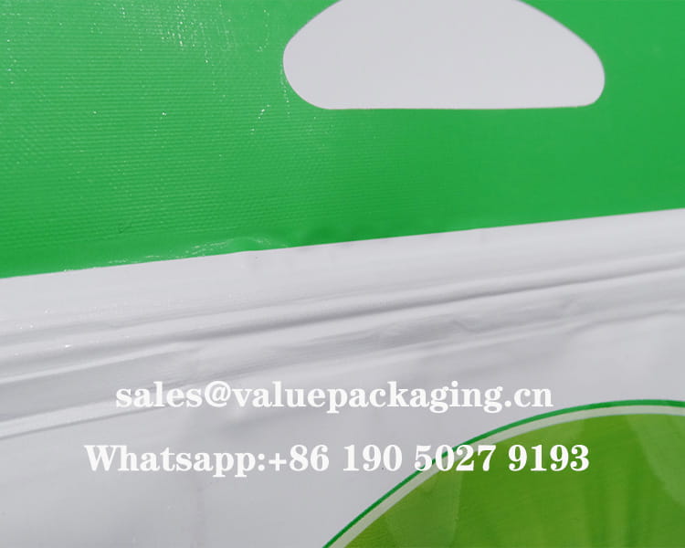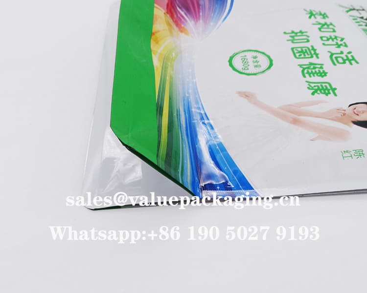 It is made of triplex layers, with the outside PET film 12 microns working as the print substrate film, the VMPET film 12 microns working as the middle barrier layer, and finally, the LDPE film working as the inner sealing layer. The thickness of the LDPE film should be adjusted to suit the requirements of 1.68kg soap powder.